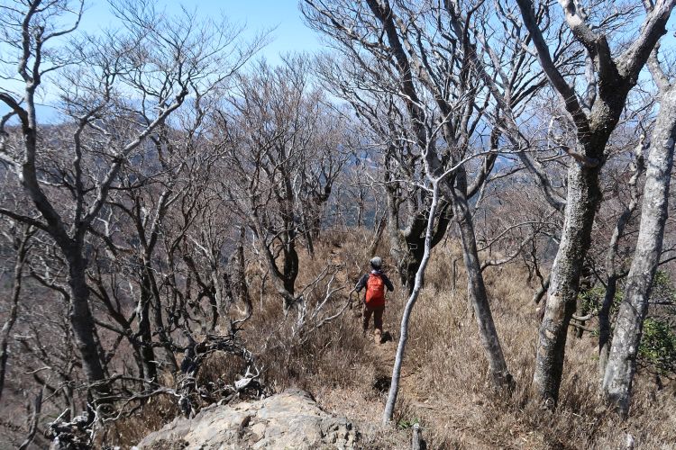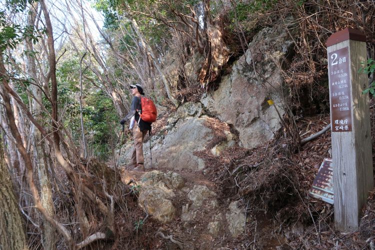 展望台からコースに戻り、5合目と熊本・大分・宮城の県境となる「三県境」を通過。六合目の手前で樹間に祖母山が見えてきた。ちなみに山頂は宮城と大分の県境で、祖母山は宮城県最高峰である。
