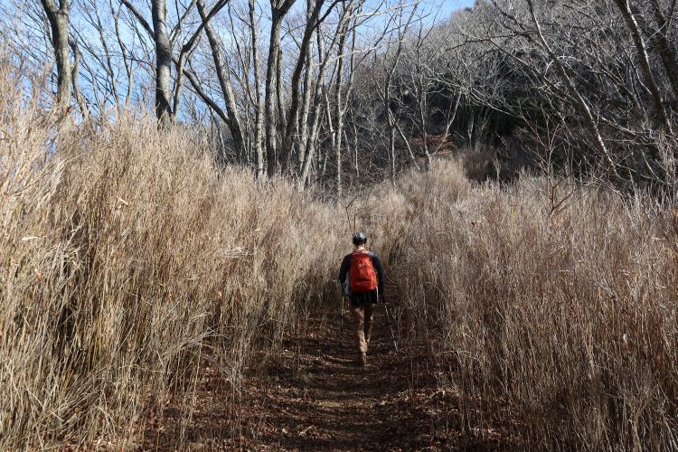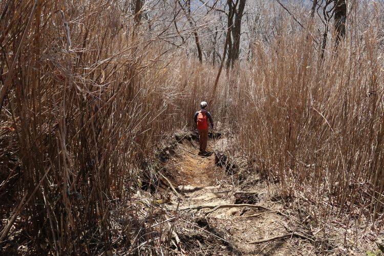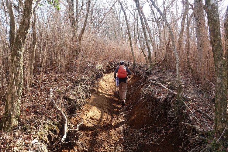 背丈以上のスズタケを下る。登山道の手入れを怠ると、すぐ藪漕ぎの道になりそうだ。