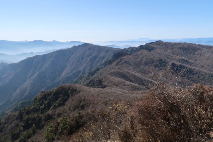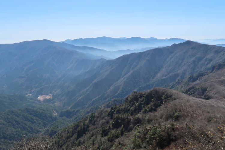 南側。手前に古祖母山(左)と障子岳(右)。障子岳の左奥に幽かに見えるのは尾鈴山。