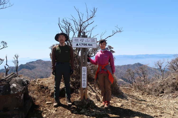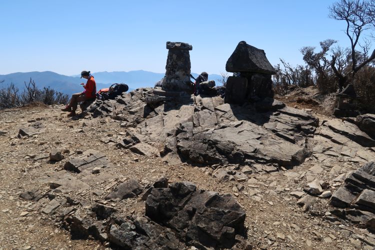 9:50 山頂に到着。山頂には一等三角点と方位盤、宮崎県側の祖母嶽社と大分県側の健男霜凝日子社(たけおしもこりひこしゃ)を祀る石の祠がある。健男霜凝日子社は九柱の神を祀っており、その中に神武天皇の祖母にあたる豊玉姫が含まれている。それが祖母山の名の由来。古くから信仰登山が行われており、嫗ヶ嶽(うばがたけ)や祖母嶽(おばがたけ)と呼ばれる神体山だった。