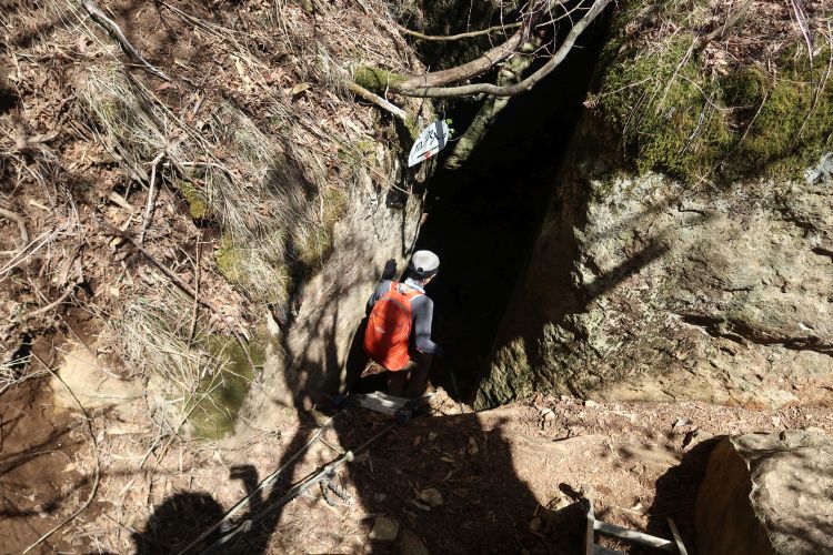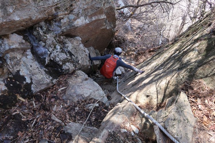 長いロープの張られた急坂を慎重に下る。