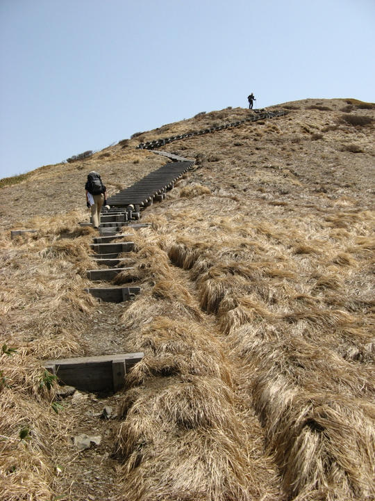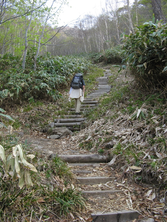 笹原の後は砕石帯となり、つづら折りの立派な階段を下りて行く。段差が丁度よかった。