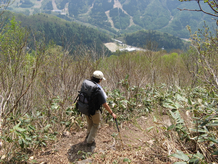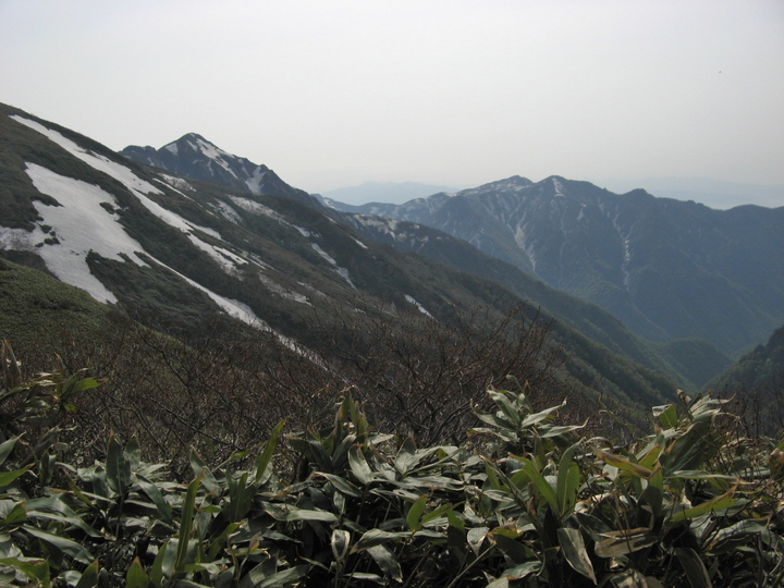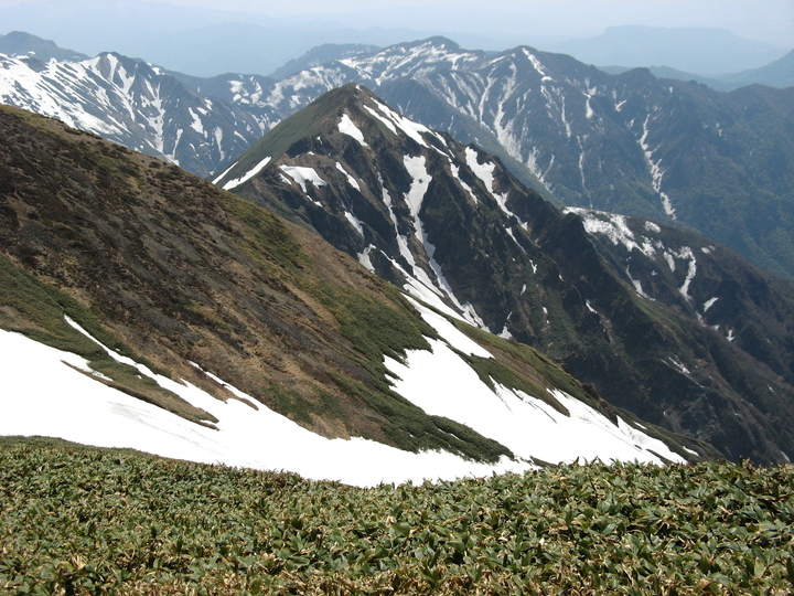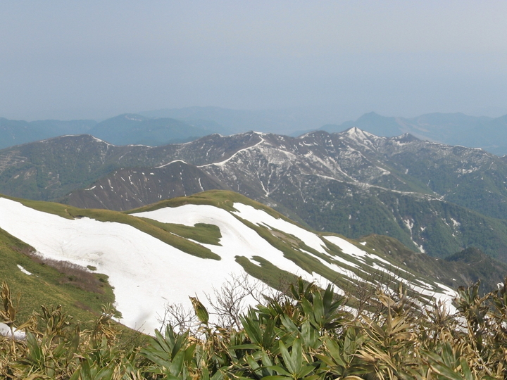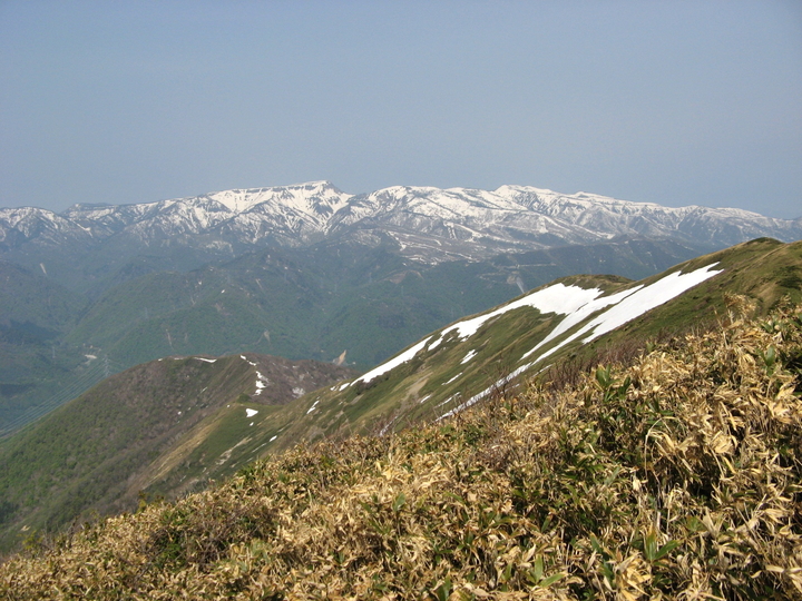 西には苗場山。手前には松手ルートとなる尾根筋が延びている。