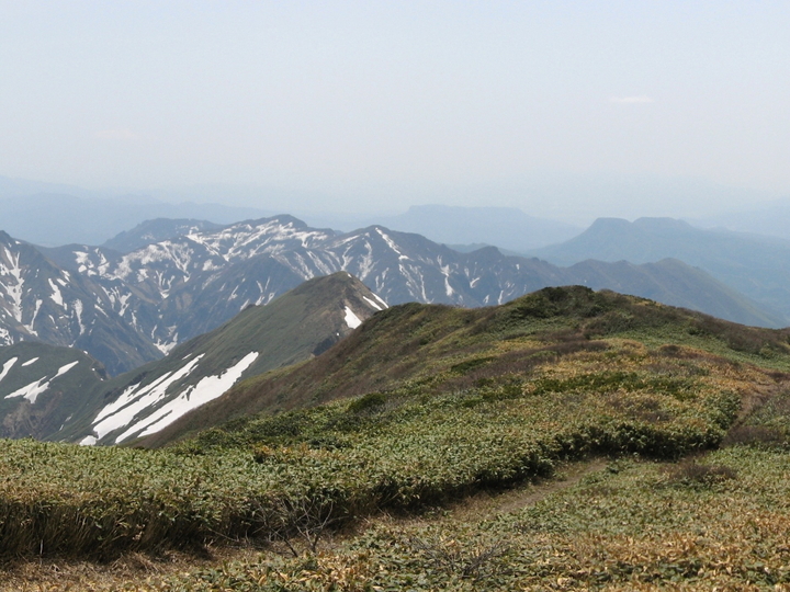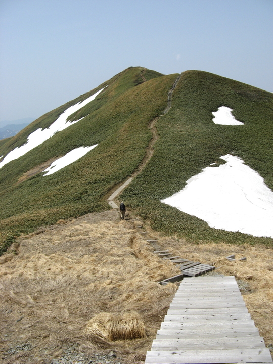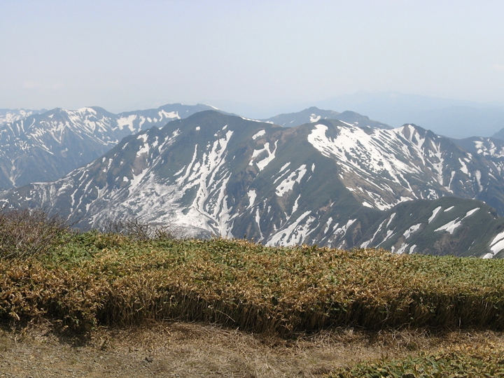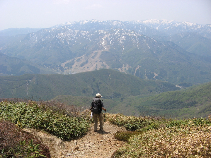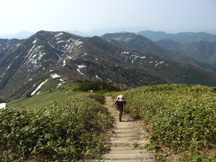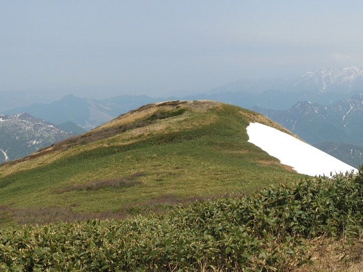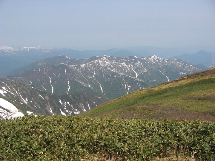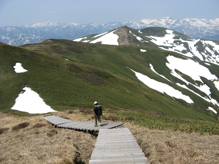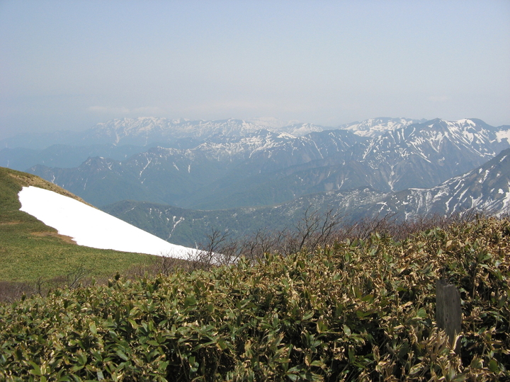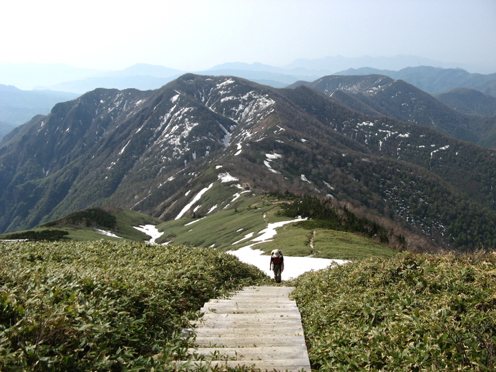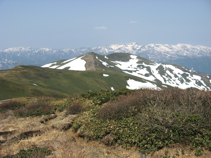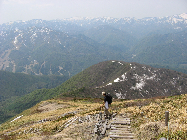 2時半起床、3時5分出発。現地には5時10分到着。日本海側に張り出した前線が気になったが、天気予報どおりに晴れの一日となった。どちらの山も頂からの展望が素晴らしく、360度の大パノラマを心行くまで楽しむことができた。登山道は木道と階段でよく整備されており、若干山歩きの面白みに欠けるが、稜線歩きは解放感抜群で終始気持ちよく歩くことができた。膝に痛みは出なかったものの、松手山を過ぎたあたりから疲れを感じ、5月とは思えないような暑さもあって、最後は疲労困憊となってしまった。