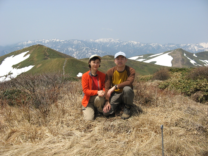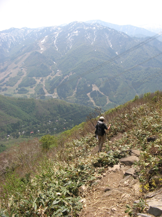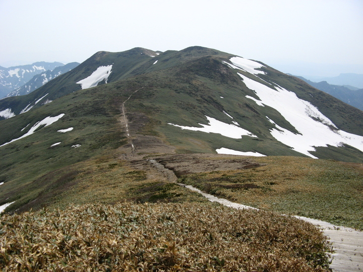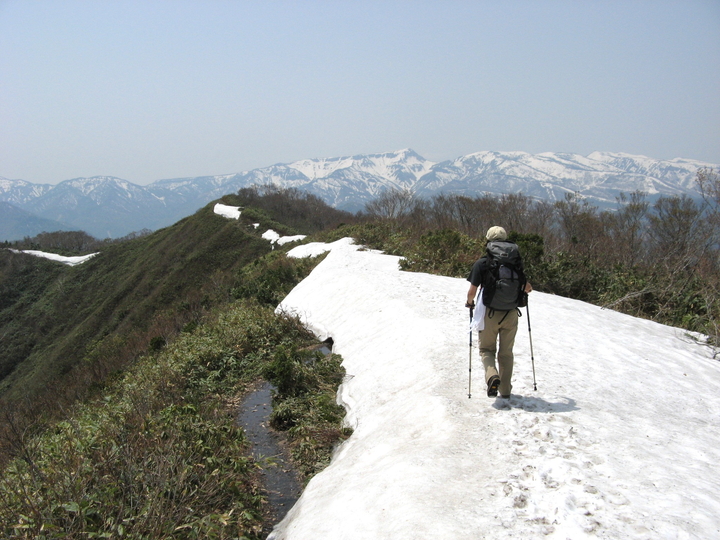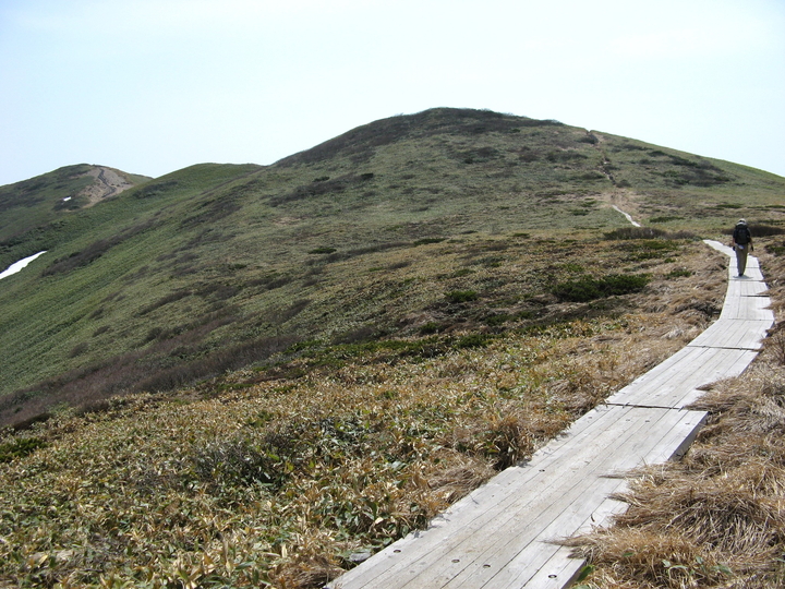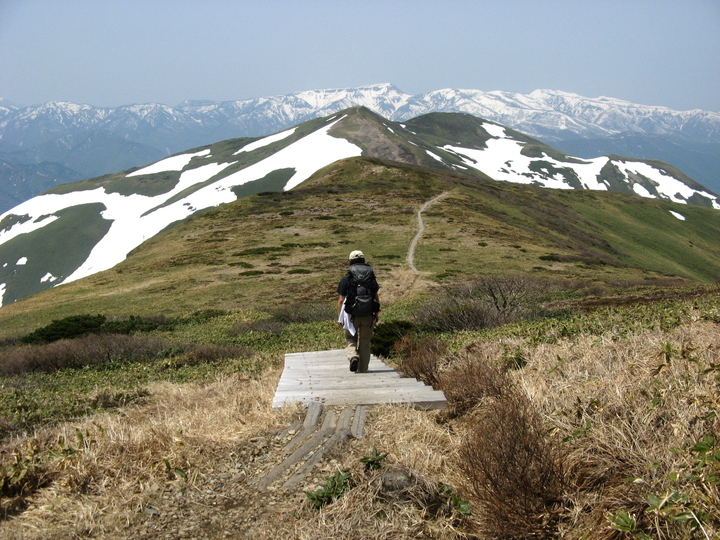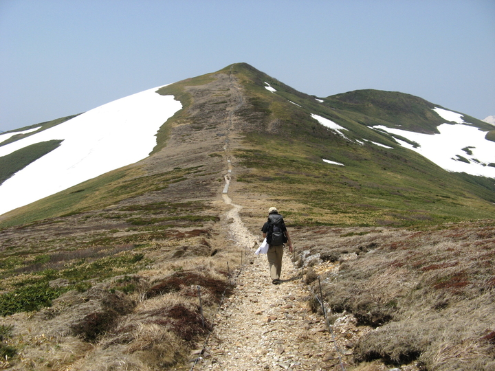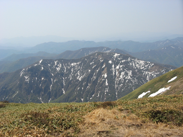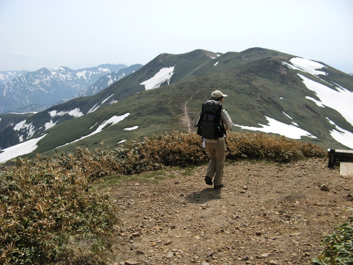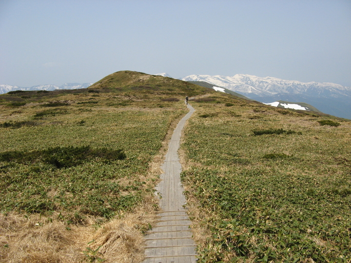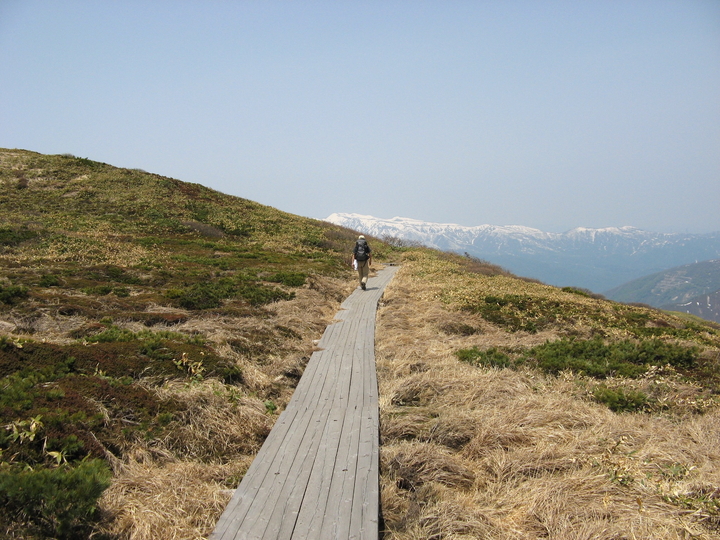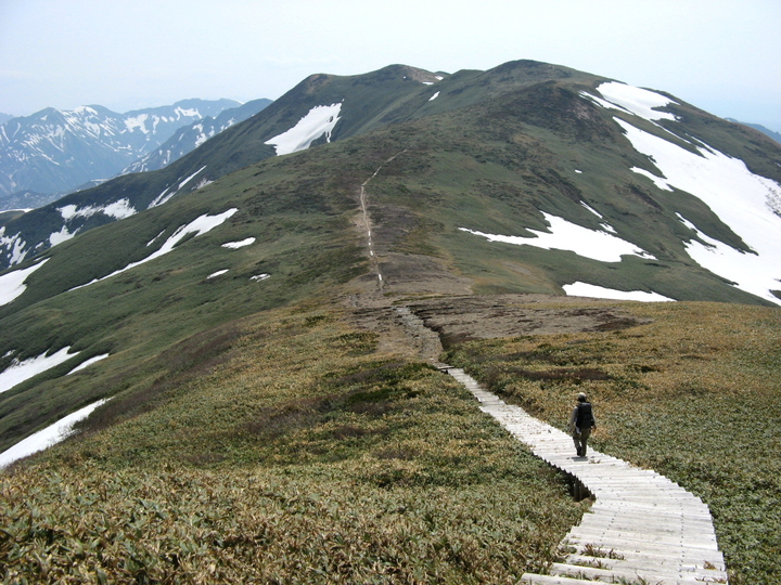 2時半起床、3時5分出発。現地には5時10分到着。日本海側に張り出した前線が気になったが、天気予報どおりに晴れの一日となった。どちらの山も頂からの展望が素晴らしく、360度の大パノラマを心行くまで楽しむことができた。登山道は木道と階段でよく整備されており、若干山歩きの面白みに欠けるが、稜線歩きは解放感抜群で終始気持ちよく歩くことができた。膝に痛みは出なかったものの、松手山を過ぎたあたりから疲れを感じ、5月とは思えないような暑さもあって、最後は疲労困憊となってしまった。