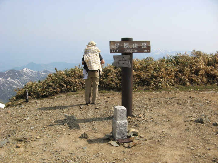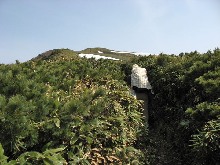 ハイマツに覆われた狭い道を抜けると、やっと平標山の山頂が見えた。