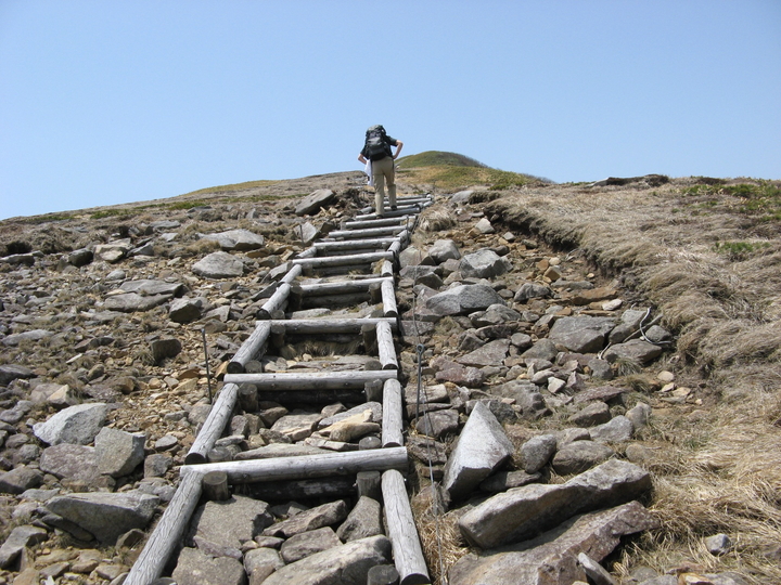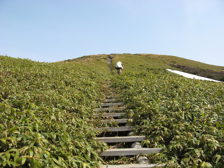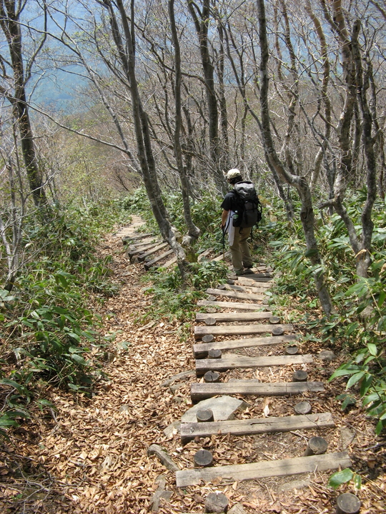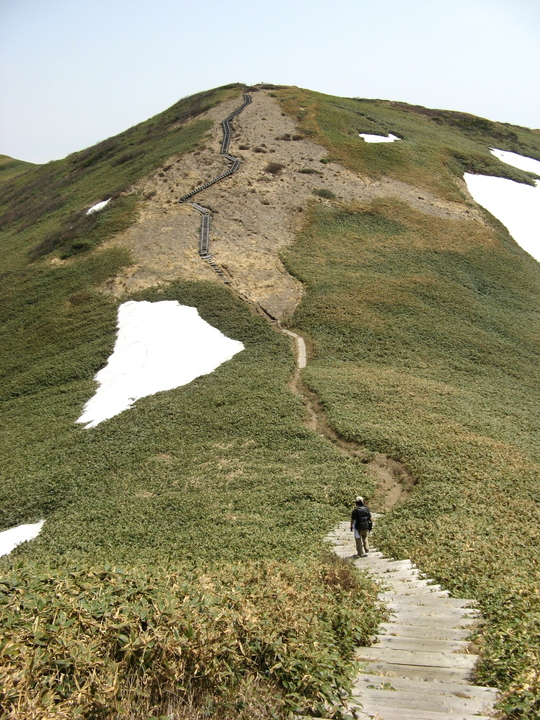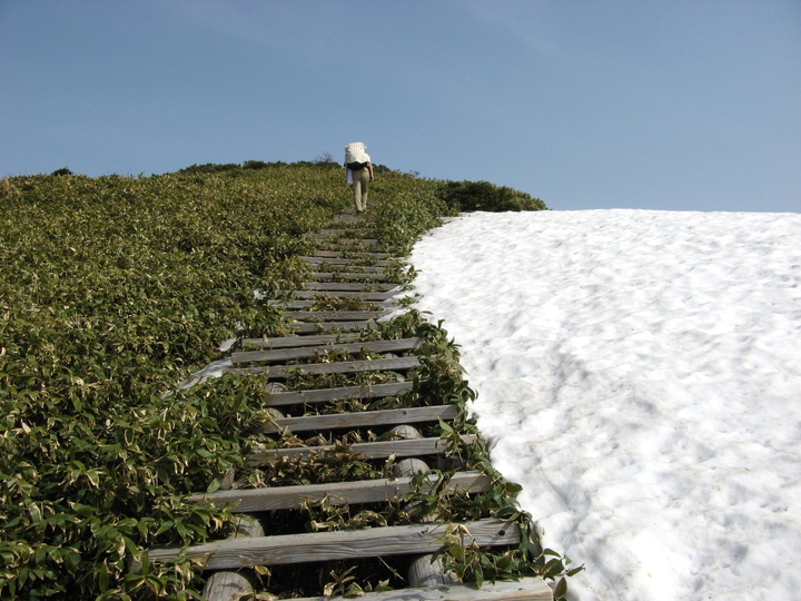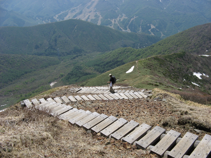 残雪をクリアするとまた木の階段。平標山ノ家がどんどんと遠くなる。