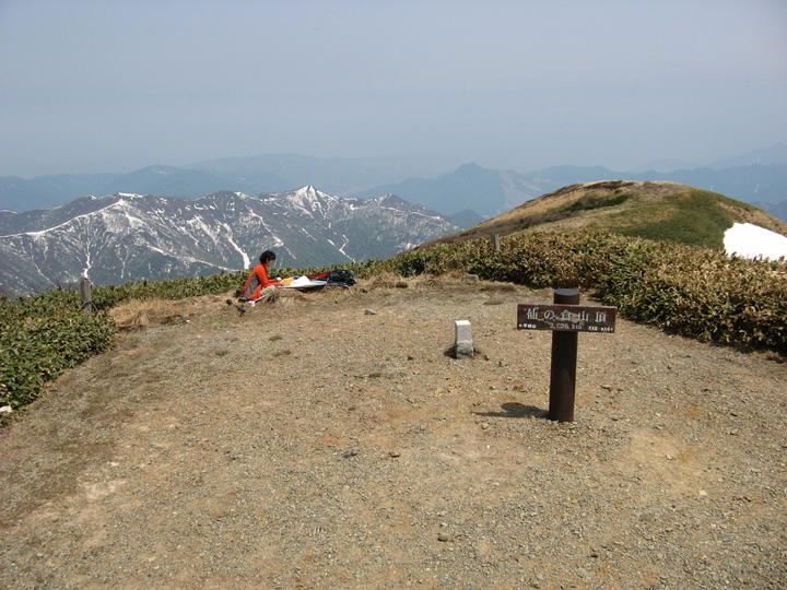 左が一ノ肩で、右奥が平標山の山頂。一ノ肩から下りてくるハイカーの姿が小さく見えた。