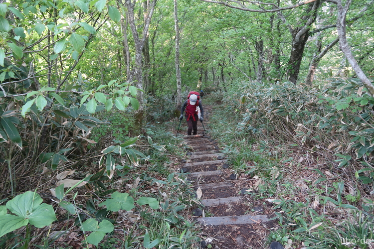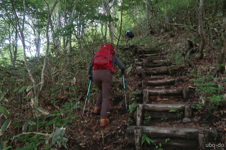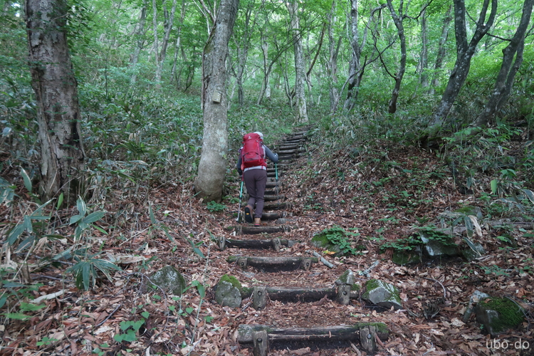 木段を上る。登山道はよく整備されていた。