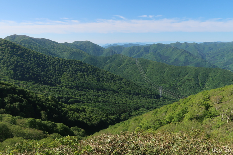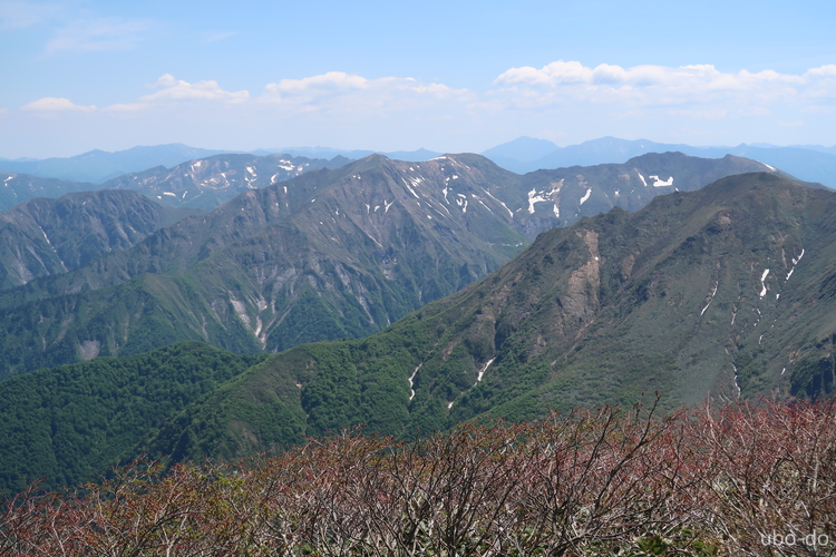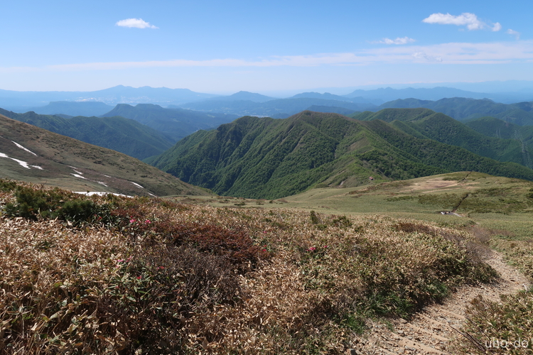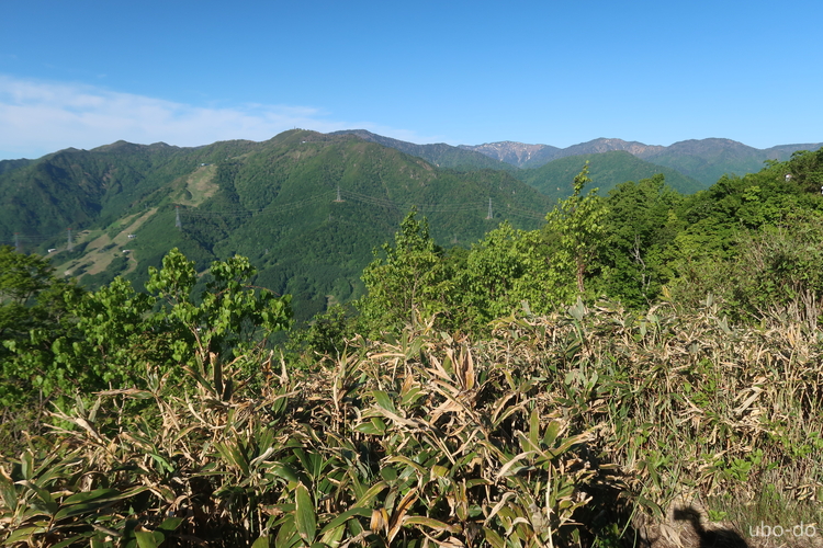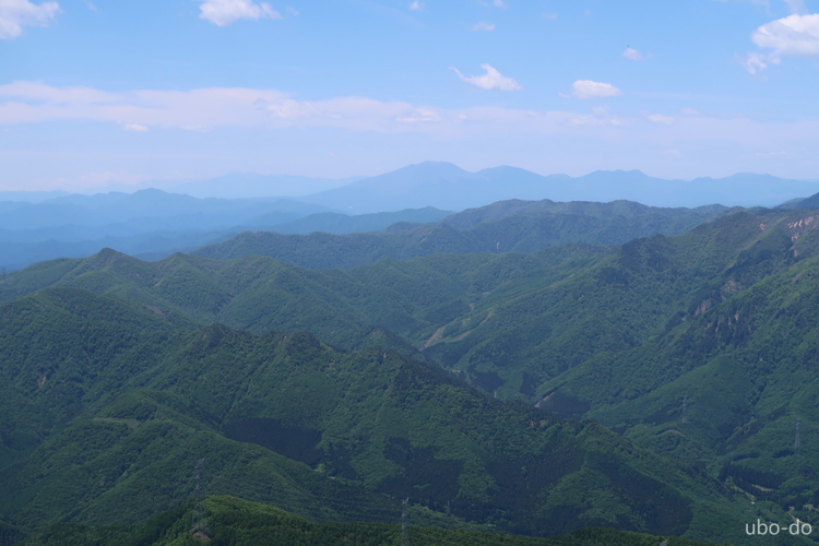 南西方面の眺め。上ってきた稜線の向こうに、上ノ倉山や佐武流山 (さぶるやま) などの山並みが見える。