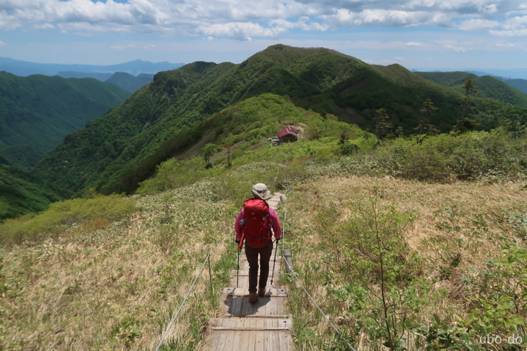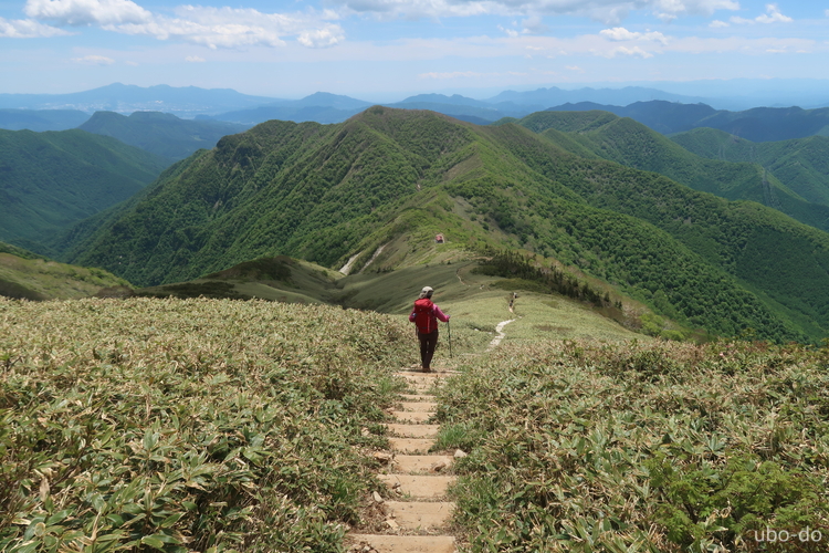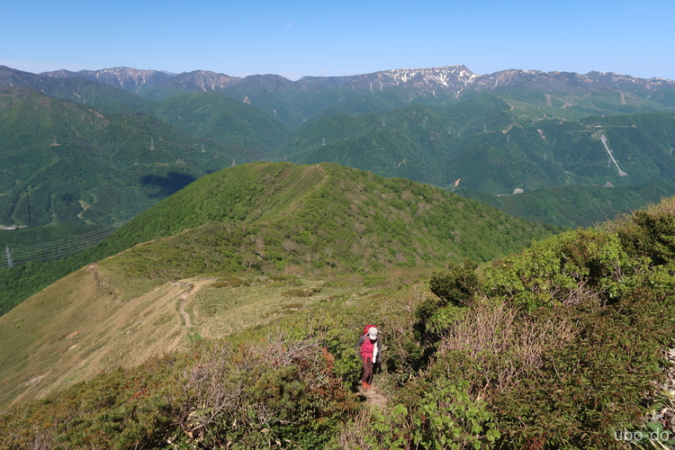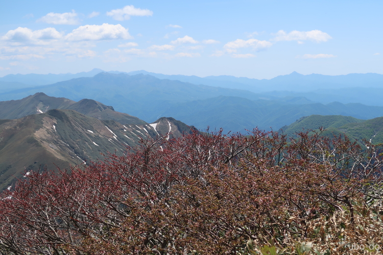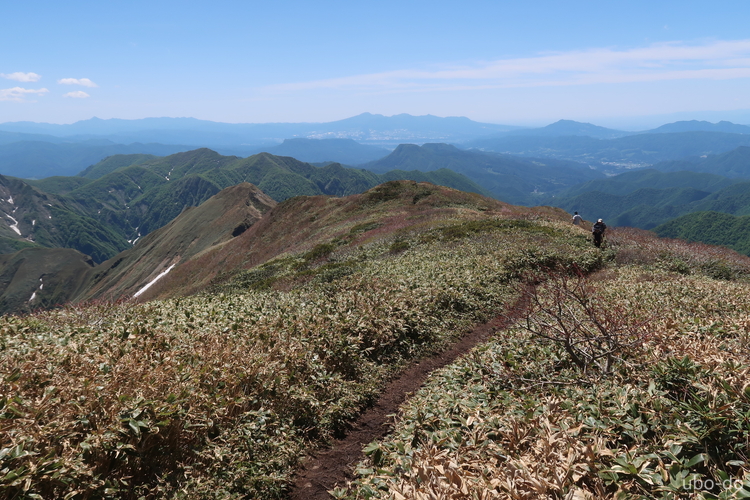 万太郎山へ続く稜線の上に、武尊山と日光白根山が重なって見える。右は皇海山。