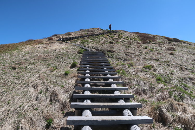 山頂直下の坂を上っていると、上から眺めている妻の姿が見えた。