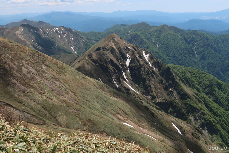 平標山に続く稜線。右の苗場山の左前の三角が平標山。