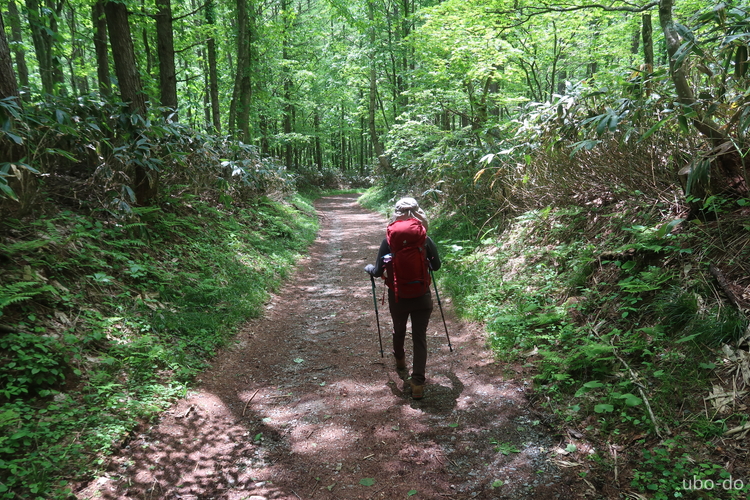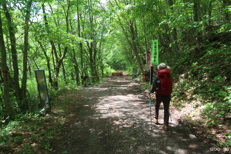 前回は川沿いの登山道を歩いたので、今回はそのまま林道を進むことにした。