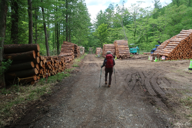 途中、伐採された丸太が山積みされていた。