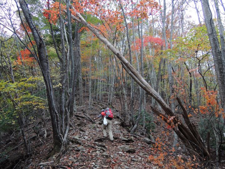 分岐を過ぎると本格的な上りとなり、鮮やかな紅葉が目につくようになった。