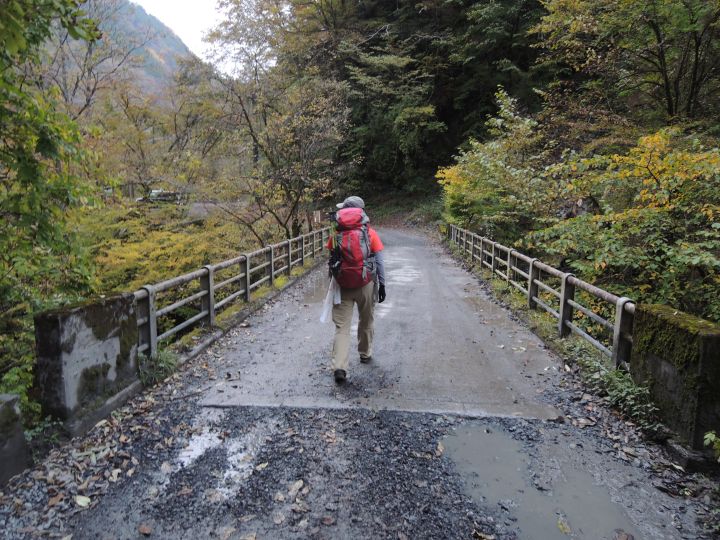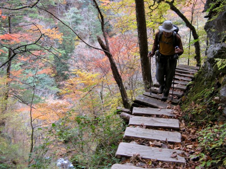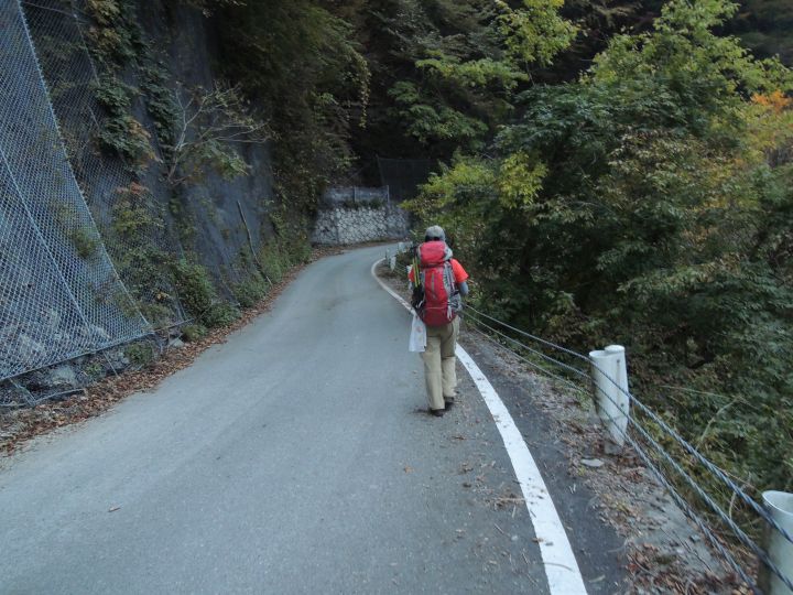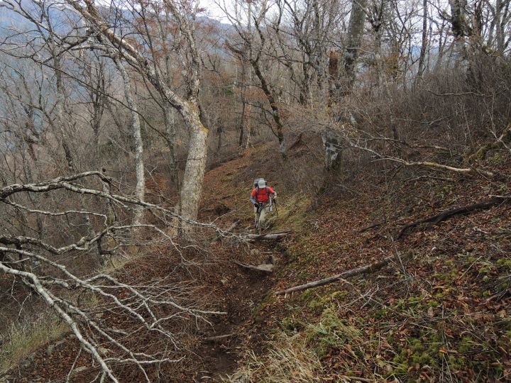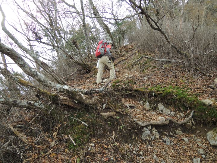 谷側が切れ落ちた道が続く。道幅が狭く、崩落気味のところもあるので慎重に歩いた。
