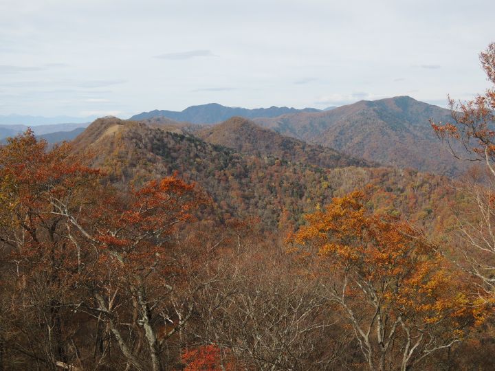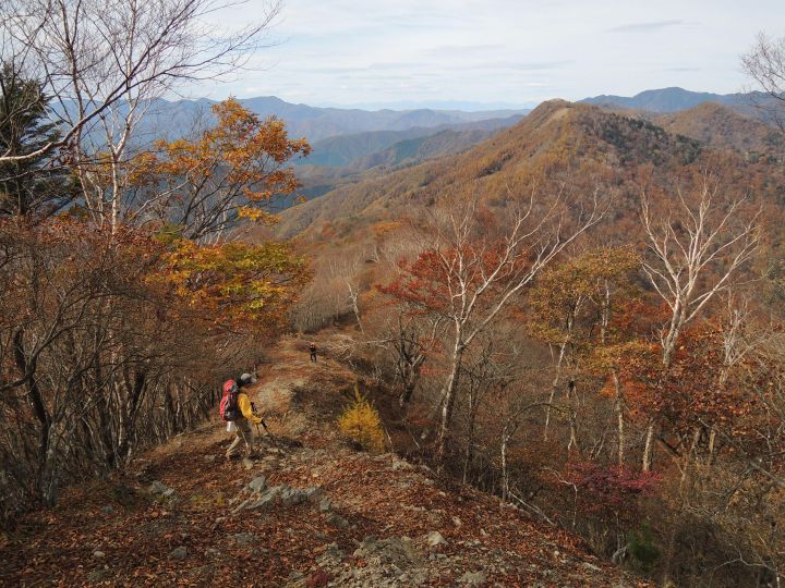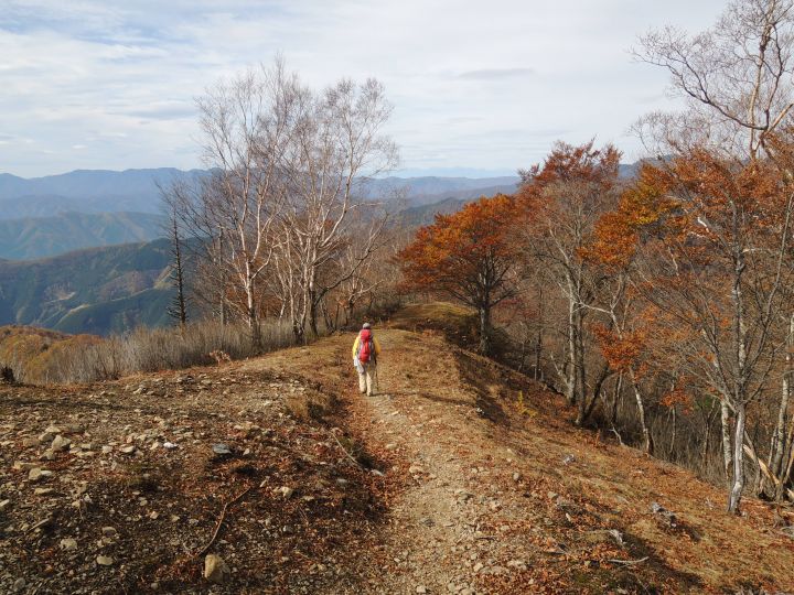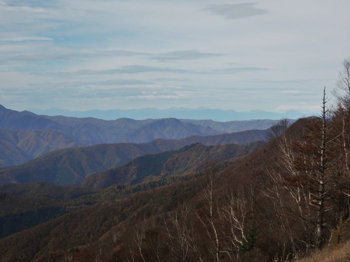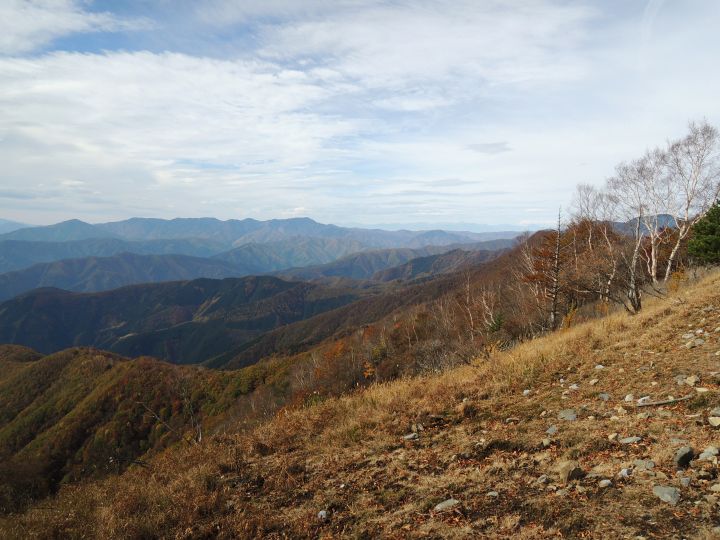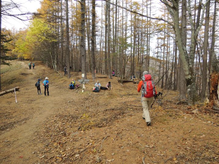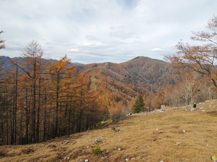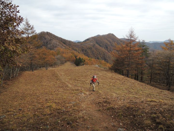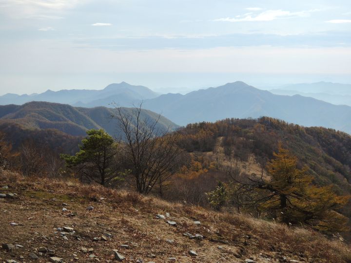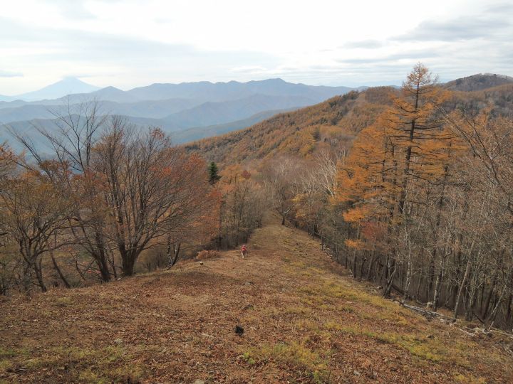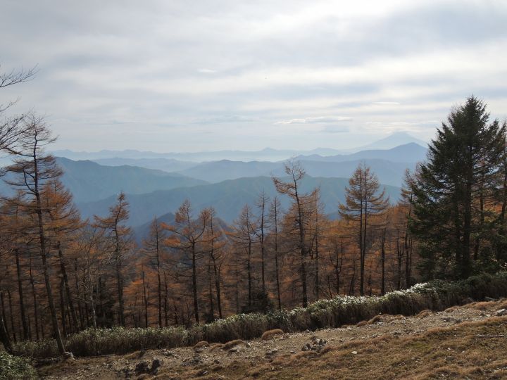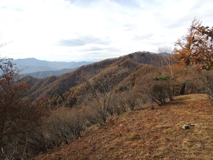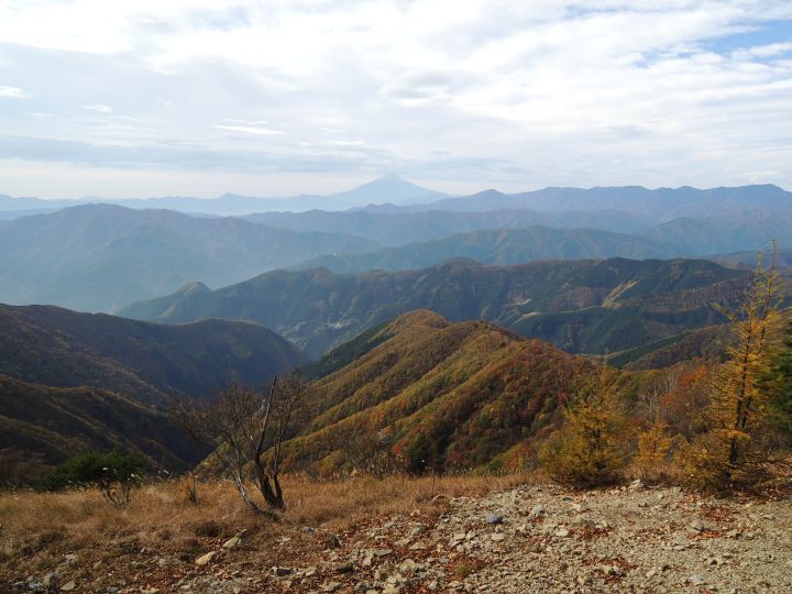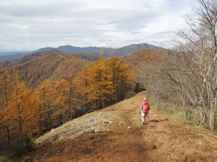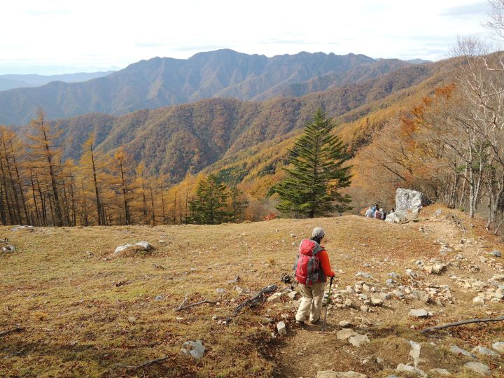 北西側に、小雲取山から雲取山へ至る石尾根が一望できた。黄葉したカラマツ林が綺麗だった。