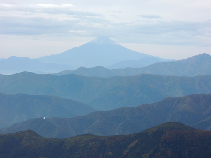 富士山の山頂部には僅かに雲がかかっていた。富士山の右手前にうっすら見えるのは三ツ峠山。