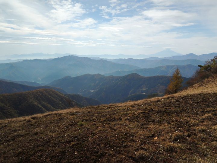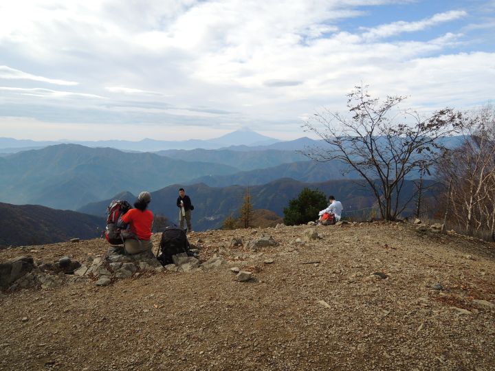 南南西方面の眺め。左に三頭山、真ん中に富士山、その右には雁腹摺山、小金沢山、大菩薩嶺と続く。