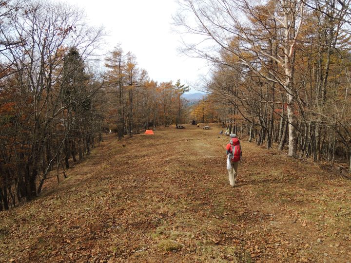 15分ほど下ると傾斜がゆるくなり、テーブルベンチやテントが見えてきた。