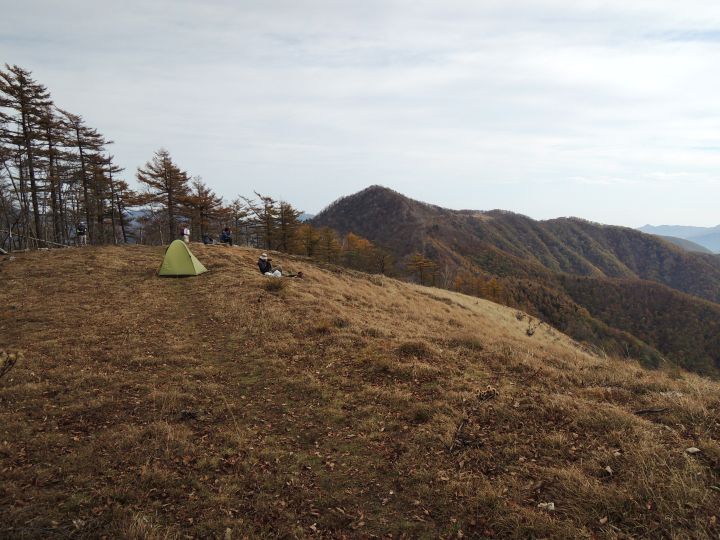 防火帯の真ん中にテントを張っている人がいた。背後は東側の鷹ノ巣山と石尾根。