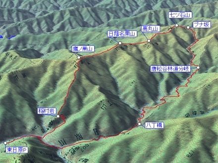 東日原P 5:35 ⇒ 稲村岩分岐 6:45 ⇒ 8:45 ヒルメシクイノタワ 8:50 ⇒ 9:20 鷹ノ巣山 9:45 ⇒ 日蔭名栗山 10:40 ⇒ 11:10 高丸山 11:15 ⇒ 12:20 七ツ石山 12:50 ⇒ ブナ坂 13:00 ⇒ 唐松谷林道分岐 14:35 ⇒ 日原林道 15:00 ⇒ 八丁橋 16:10 ⇒ 東日原P 17:00