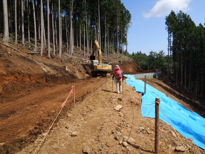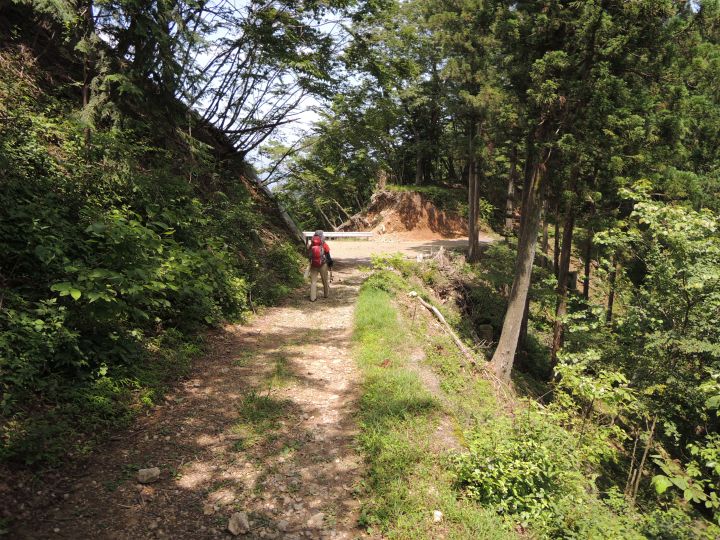 8:45 山伏峠の林道に出た。工事をする重機の音が聞こえていた。