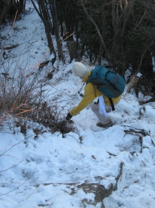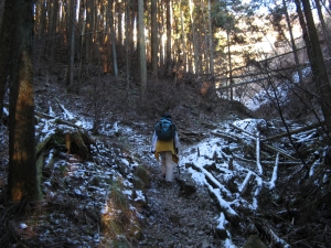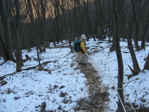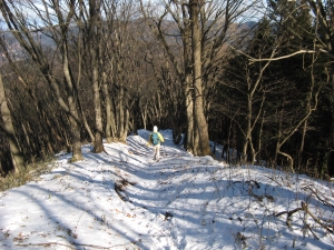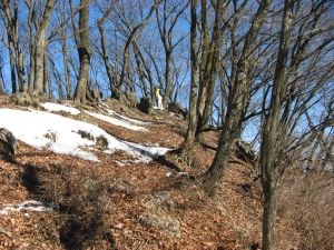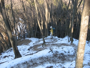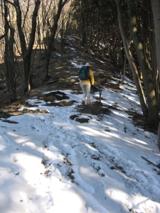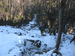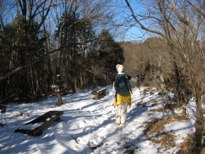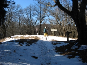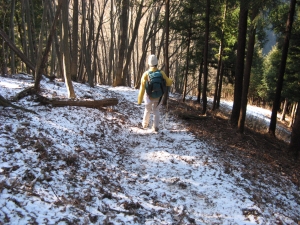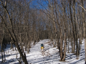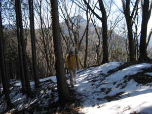 尾根道は雪の吹き溜まりができていて、場所によっては雪が深かった。何度か軽アイゼンの使用を考えたが、そのまま進んだ。