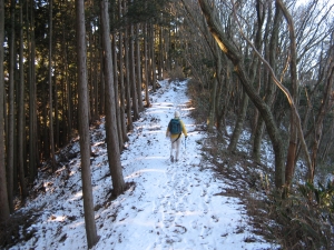 いつもならなだらかな下り坂を飛ばして歩くのだが、雪で滑るためにスピードを上げれなかった。