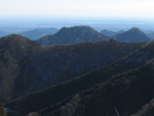 北西方面。両神山、二子山、赤久縄山、御荷鉾山、城峯山と続く山並。