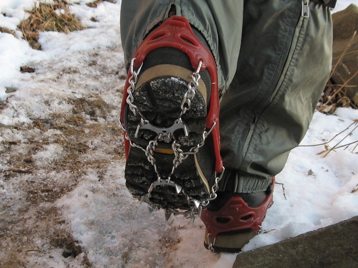 北側斜面へ移る手前でモンベルのチェーンスパイクを装着。簡単に着脱できるのでとても便利。