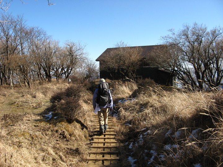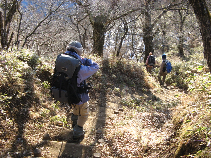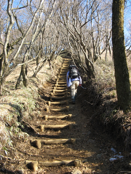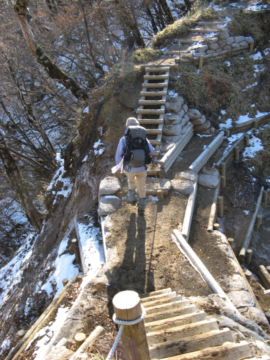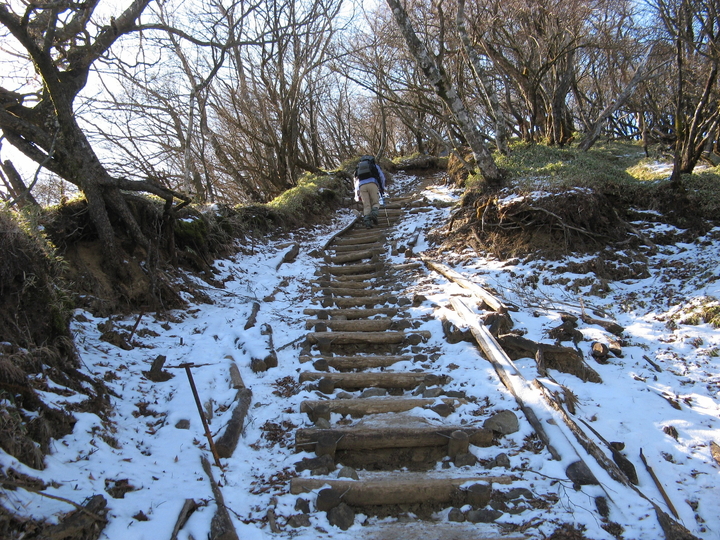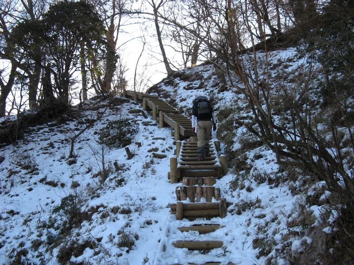 最後は山頂まで100mほどの上り階段が続く。北側の斜面なので、木の階段は凍結した箇所が多かった。