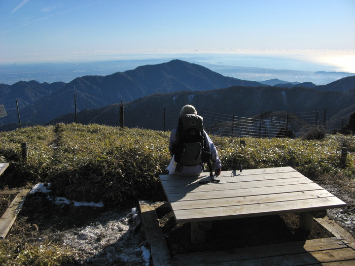 風を避けて南東側の角材に腰を据えた。遮るもののない山頂は広くて眺めがよく、解放感抜群。