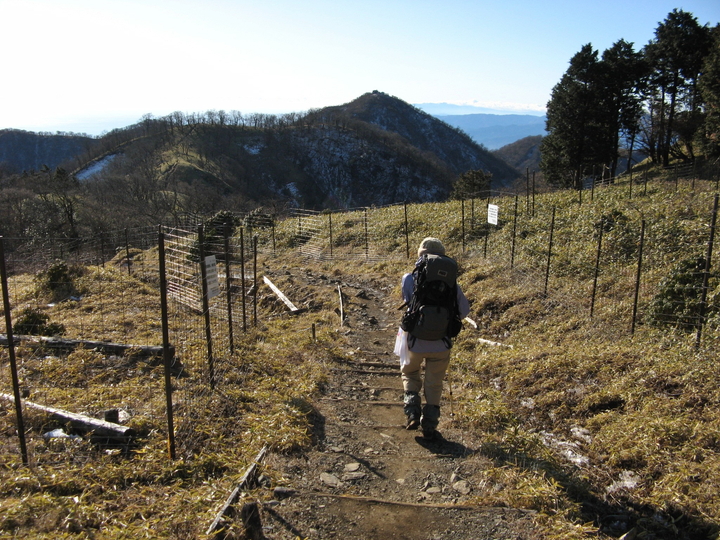 5分ほど休んで再スタート。登山道の周りにはシカ除けネットが張り巡らされていた。