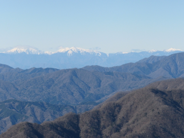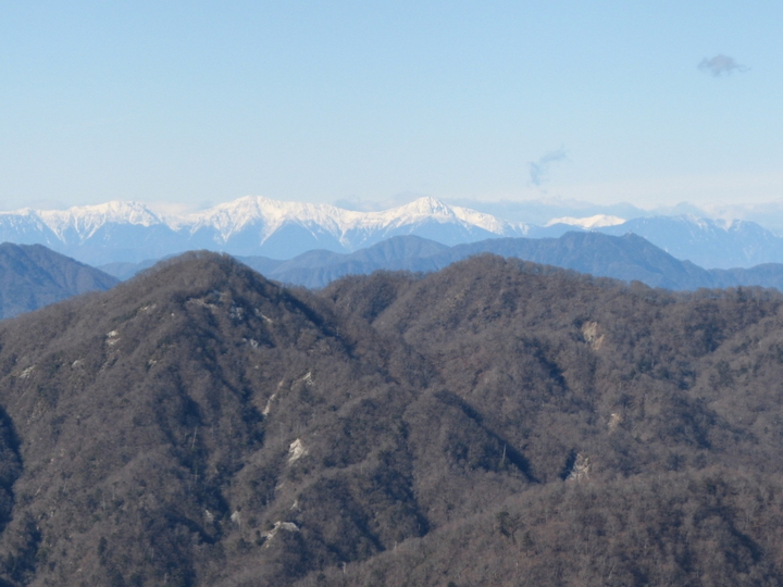 南アルプスのアップ。左に赤石岳と悪沢岳、右端に塩見岳。/p>