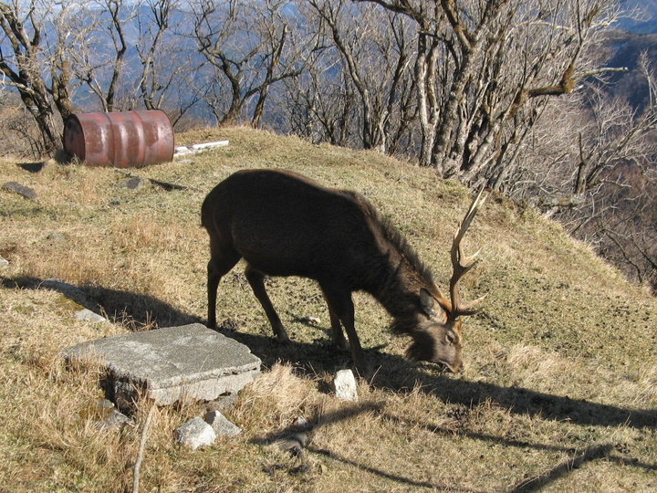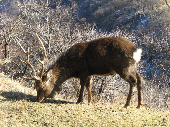 辺りはシカの糞だらけだが、気にせずに草を選んでもぐもぐ。警戒心が低く、人慣れしているようだ。