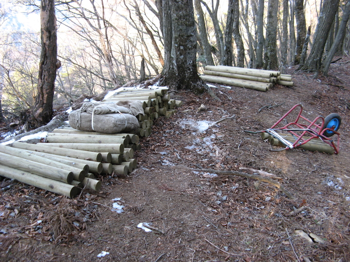 途中に積まれていた木道整備用の丸太。