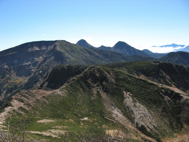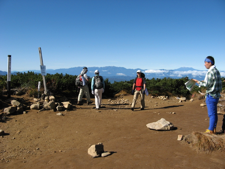 東天狗岳も360度の大展望だが、山頂が狭い分だけ1ヵ所からぐるっと見渡すことができる。西から北にかけて北アルプスがよく見えていた。まずは西側の乗鞍岳。