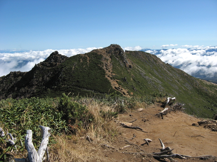 東側には東天狗岳。北東には雲海が広がっていた。左奥の尖塔にも登山者の姿が見えていたが、偽ピークとどこかに書かれていた天狗の鼻だろうか。