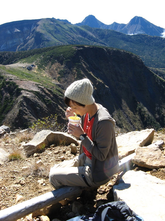 12:50 東天狗岳から60分で山小屋のある黒百合平に到着。多くのハイカーがベンチで休んでいた。