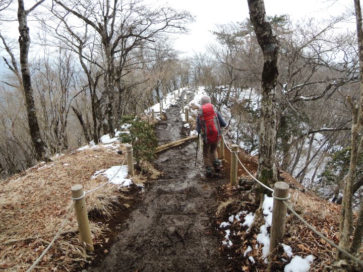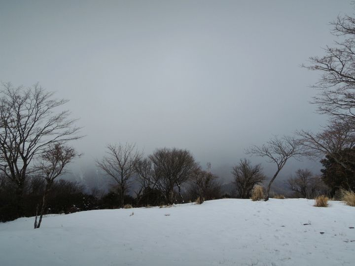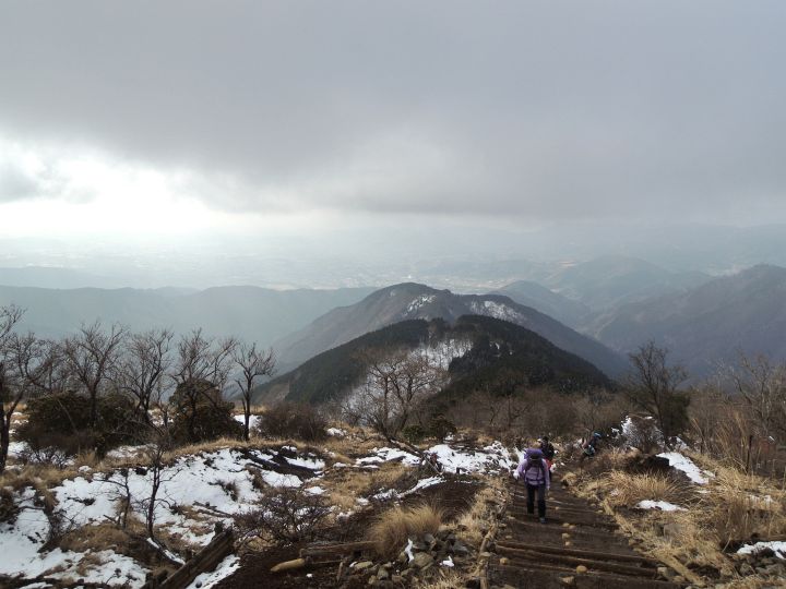 樹林帯を過ぎると積雪はなくなったが、支障がなかったのでそのままチェーン・スパイクを着けて歩いた。雲がどんよりと広がって相模湾はほとんど見えなかった。