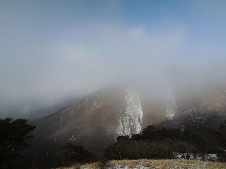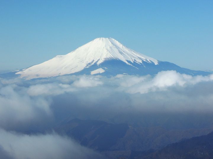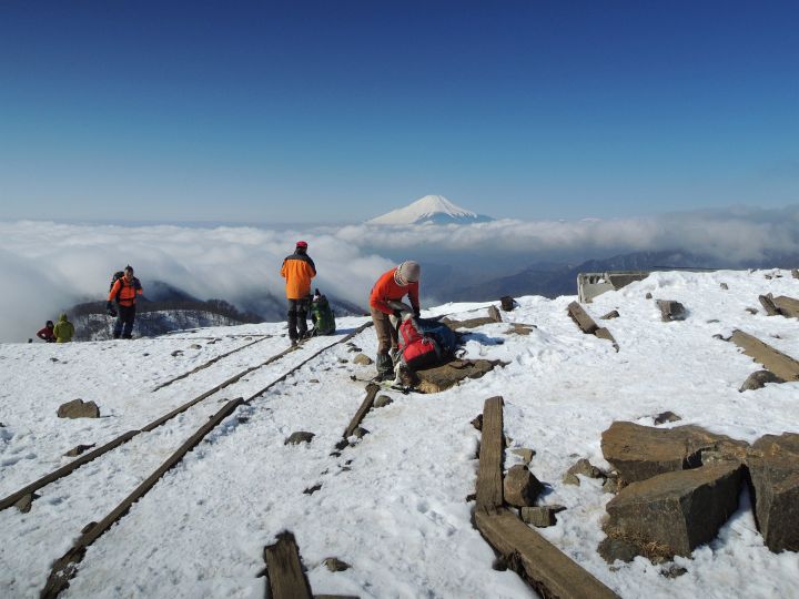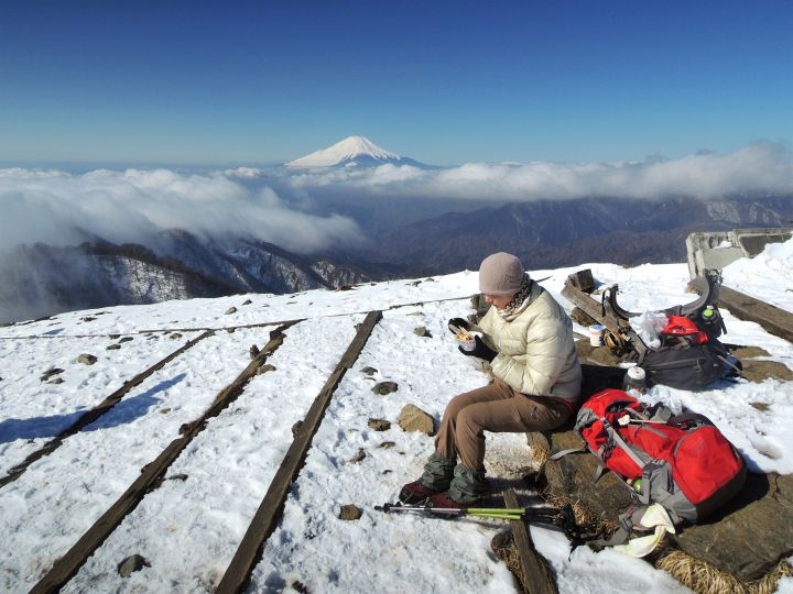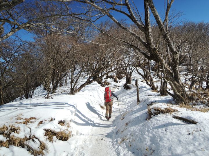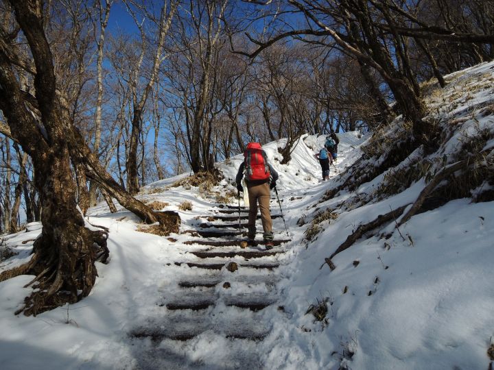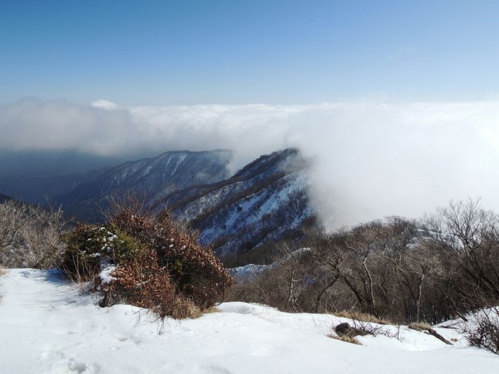 4時起床、4時半出発。県民の森には6時15分到着。無料駐車場へは一番乗りしたが、後続車が立て続けに現れて、狭い駐車場はあっという間に満車となった。早朝からどんよりと雲が広がった状態だったが、花立山荘を過ぎたあたりで雲の上に出たようで、見違えるような青空となった。この日の塔ノ岳山頂は南東側に眩しいばかりの雲海が広がり、これまでとは違う眺めを楽しめた。鍋割山へ向かう稜線歩きは霧の立ちこめる幻想的な雪山ハイクとなり、これもまた味わいがあった。