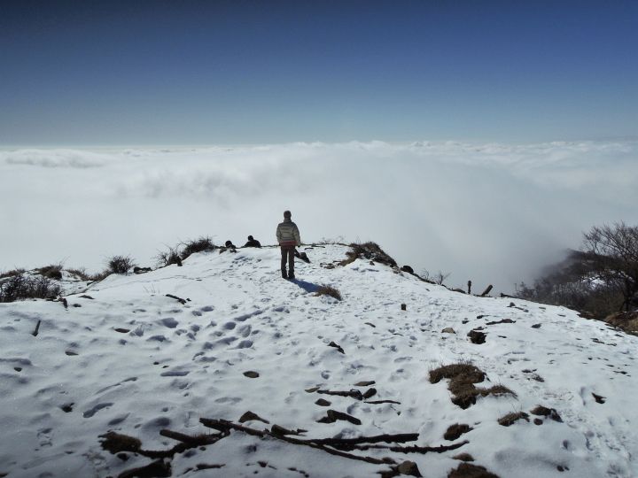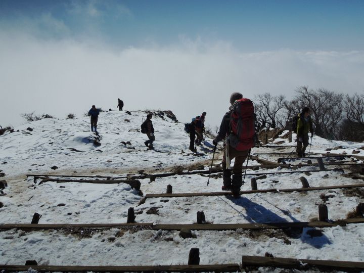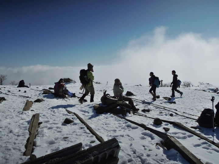 気持ちのよい雪道を進む。稜線が雲の上に出た感じで、すっきりとした青空が広がっていた。