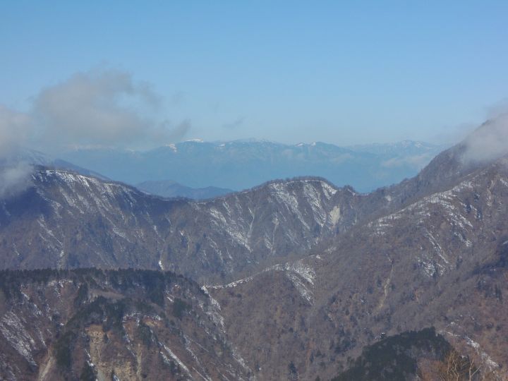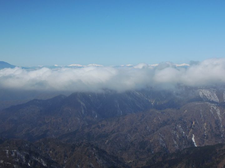 蛭ヶ岳の左奥。真ん中に黒岳と雁ガ腹摺山で、その上に金峰山と国師ヶ岳が重なる。右は大菩薩嶺と三宝山。左の八ヶ岳には雲がかかっていた。