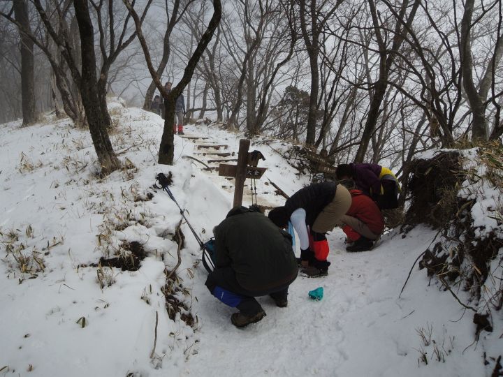 泥で足場がゆるいので、積雪がなくなった後もチェーン・スパイクを着けたままで下った。