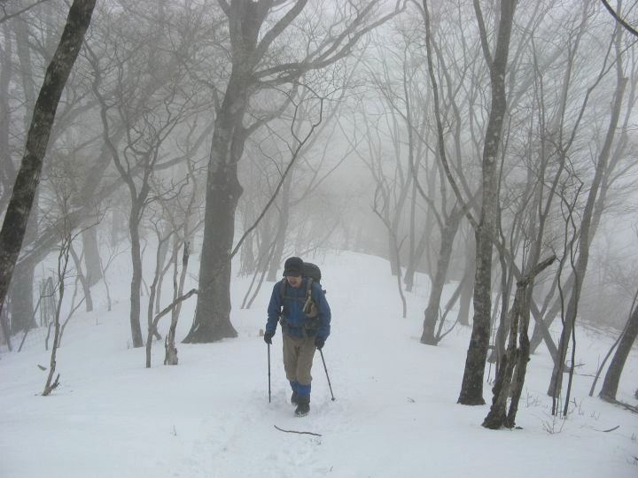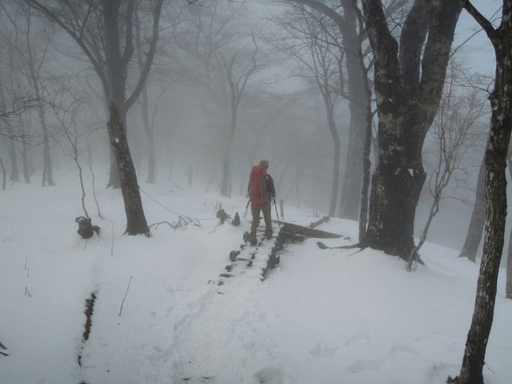 霧に覆われた雪の樹林帯は幻想的で、まるで違う世界を歩いているように感じた。