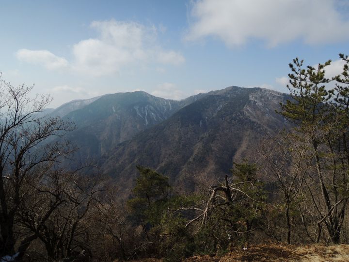 樹間に見えた蛭ヶ岳(左)と不動ノ峰(右)。