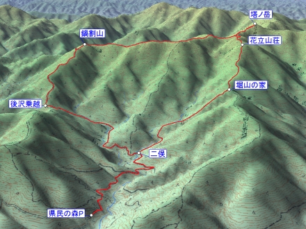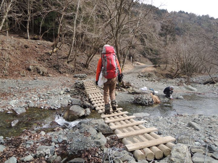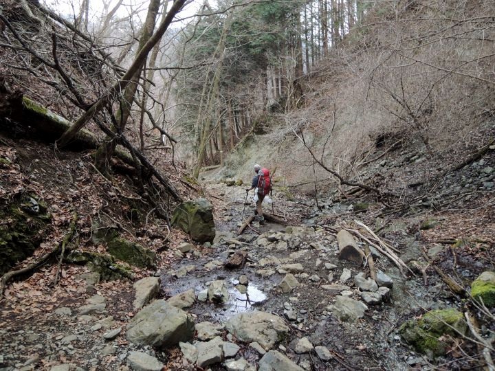 今回は二俣から破線ルートを堀山の家へ向かった。勘七沢沿いにアップダウンがしばらく続いた。