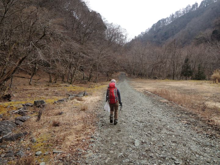 土が乾いてきたのでチェーン・スパイクを外し、急坂をどんどん下った。12:50 後沢乗越に到着。